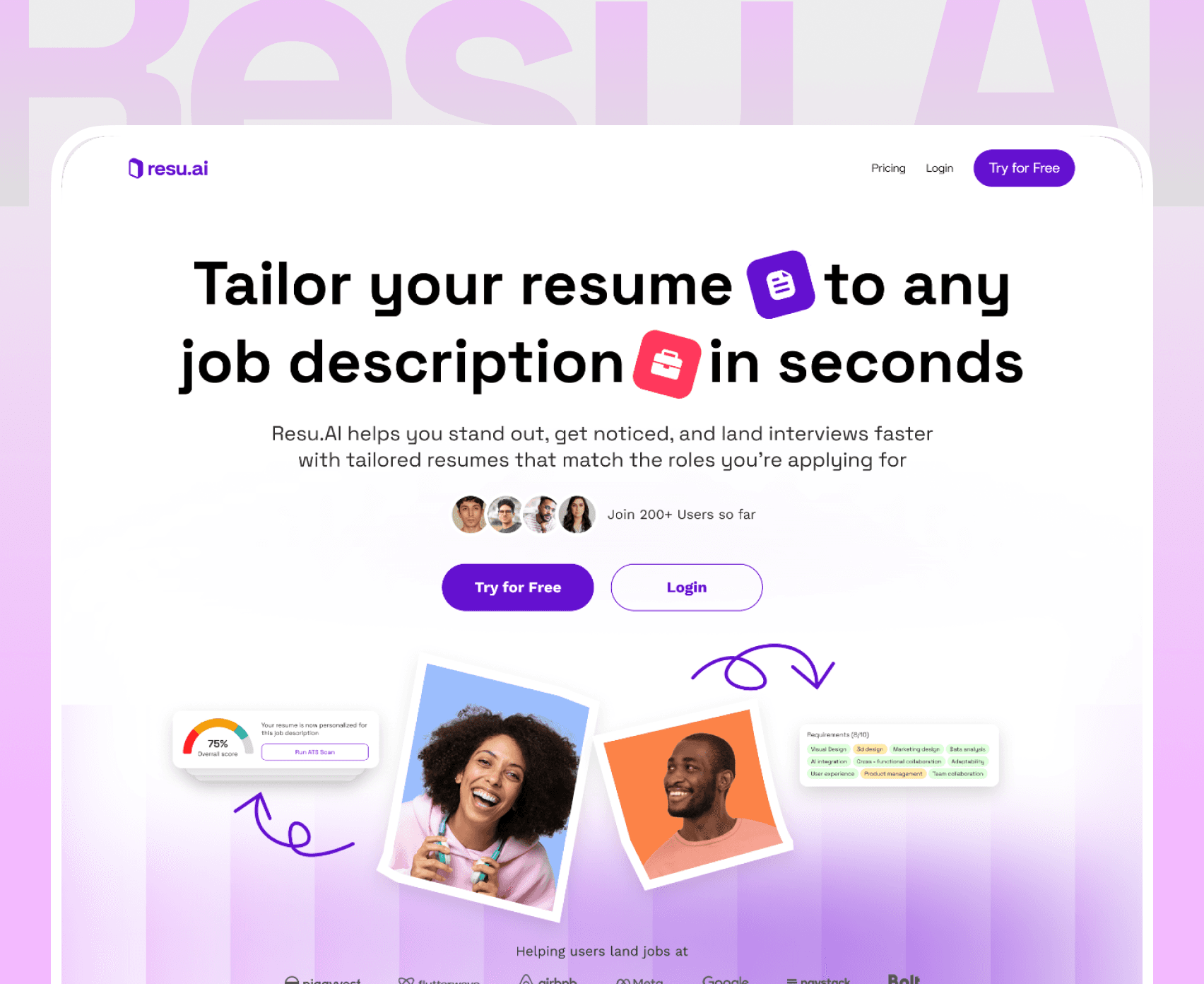 Resu.AI is an AI-Powered tool that tailors existing resumes to match any job description thus increasing interview prospects by over 30%.